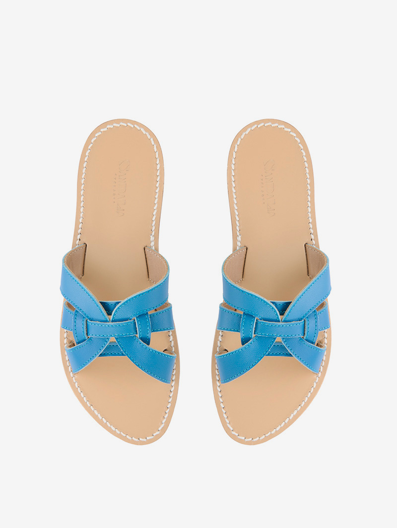In Greek mythology, Psyche is represented with butterfly wings, symbolized in this sandal with the two crossed straps brought together in this infinitely sophisticated slide sandal.